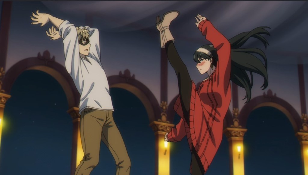 And that includes manipulating circumstances so that Loid and Yor get their first head-to-head fight scene. The whole second half of the episode is an action extravaganza, with a number of low-danger-level, slickly-animated action sequences; a personal favorite was the one where Loid dives onto the balcony and rolls. Out of all that, though, the highlight is unquestionably the completely soused Yor losing track of the fact that she’s supposed to be just play-acting and going after Loid for real. That’s a sequence that I expect to se GIFs of and people still talking about come to the end of the year, as it’s not at all clear that Loid could have beat her if she hadn’t passed out in the middle of it.