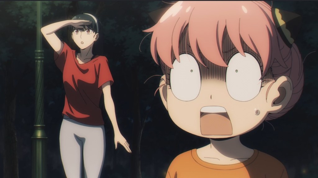 One of the running jokes of the series is that Yor, for all of her domestic incompetence, is superhumanly capable physically. That gets reinforced here. A second, more developing running joke is that Yor is probably the last person who should be teaching Anya anything beyond just basic physical fitness. The combination of the two lead to two of this episode’s three funniest scenes, which involve what Yor can do with a dodge ball. You do not want to ever play against Yor in dodge ball.