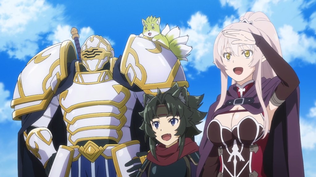 As appreciable as Arc is as a character, the supporting cast make big contributions as well. Ponta may fill the requisite Mascot character role, but he is somehow less obnoxious than most of these characters are and serves an important purpose by showing that Arc, despite his oddities, can be trusted. (Creatures of his type are known to never associate with those who aren’t good at heart.) The busty, sword-specialized elf Arianne fills the requisite Sexy Female Companion role, and does seem to be gradually growing to like Arc as he helps her rescue some elves caught up in human trafficking (elf trafficking?), but she earns points for being both quite capable on her own and having a steadfast purpose beyond just accompanying Arc; that he is accompanying her is, in fact, a far more accurate description. The way they grow to respect each other feels natural as well. Much later, they encounter and eventually start working with Chiyome, a ninja catgirl from an animal person village that appears to have been heavily influenced by a previous isekai visitor. (Don’t expect that tantalizing mystery to be explored further before the end of the series, though.) She is not around Arc enough for much of a relationship to develop before the end of the season, but she is also quite capable and has a skill set which complements the other two well. There’s also a male ninja from her village who constantly gets into contests of brute strength with Arc but also teams up with him quite synergistically when the need arises, but (sadly) he is not a regular traveling companion.