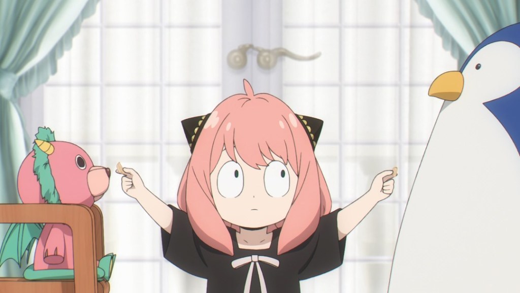 But for all of the hijinks at the aquarium, the best part was undoubtedly the final segment where they are back home and Anya is playing pretend-spy with her plushies. Anya may have her telepathy and be quite clever for her age, but she’s still a little kid, and that was a beautifully-portrayed full-blown Kid Mode there. (Of course, the irony that her make-believe isn’t that far from the truth is probably lost on no one.) The way Loid and Yor instantly jumped to play along to calm Anya down after she ventured towards dangerous areas was a wonderfully charming bit of parenting, too.