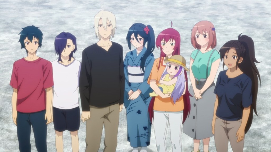 As it turns out, Mikitty isn’t as thoughtless as all that. The first season briefly showed that Mikitty was aware of way more than she should be about the Enta Islans, so there’s every possibility that her recommending them to help out her niece Amane Ohguro, who needs live-in seasonal workers for her beachfront shack, was as much part of a bigger scheme as just doing a solid for a relative. Indeed, Amane’s words at the end of the episode, her earlier tale about ghost fishermen, and the giant outline in the fog all suggest that something supernatural may be afoot out on the beach as well. Perhaps this will eventually lead to some clues about the first series’ biggest unresolved mystery: who and/or what Mikitty really is? More immediately important, though, is Emi manufacturing an excuse for her and Suzuno to travel to the same location to check up on Maou (and perhaps keep Alas Ramus from flipping out over not getting to see “daddy” for a long while) and Chiho finding her own reason to come as well.