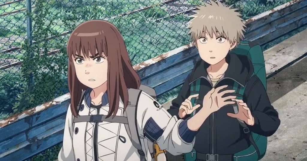 This is one of those series which doesn’t bother explaining itself at all; it expects viewers to intuit everything based on bits and pieces. At some point a decade or more in the past, an apocalyptic event called the Collapse occurred which wrecked much of the world and left many of those who survived to starve. The story splits between two very different settings: in the ruined lands, a young woman escorts a teen boy on a quest to find a place called Heaven, with old bandits and a man-eating, bird-like monster as potential threats, though they do also find some seemingly-genuine hospitality to. In the place that is presumably Heaven, children live, attend school, and play in a futuristic facility totally closed off from the outside world by walls and a ceiling; they’re not even sure an outside world exists. But one student gets curious about it after receiving a strange message about going there during a test.