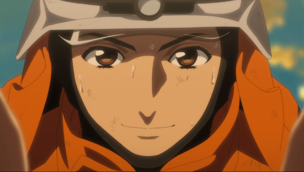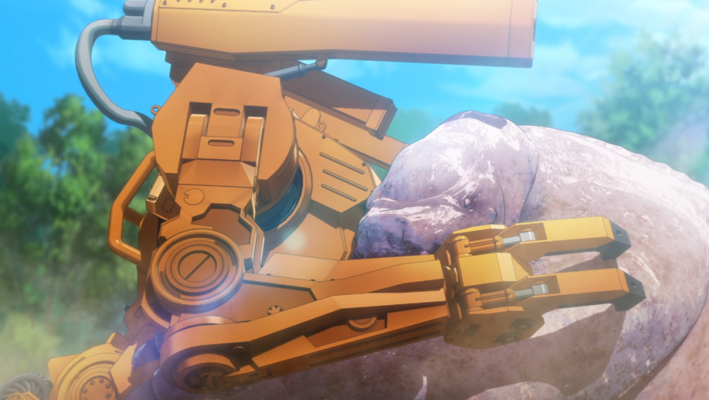 This season’s dedicated mecha entry is a decidedly unconventional one. Sure, it still has mecha fighting large monsters, but these are tractor-sized mecha which, in the cruder versions, look and feel more like actual construction equipment. Even the new, titular model is not the elegant knight of the battlefield so commonly-seen in mecha series. And this is, I think, the point.