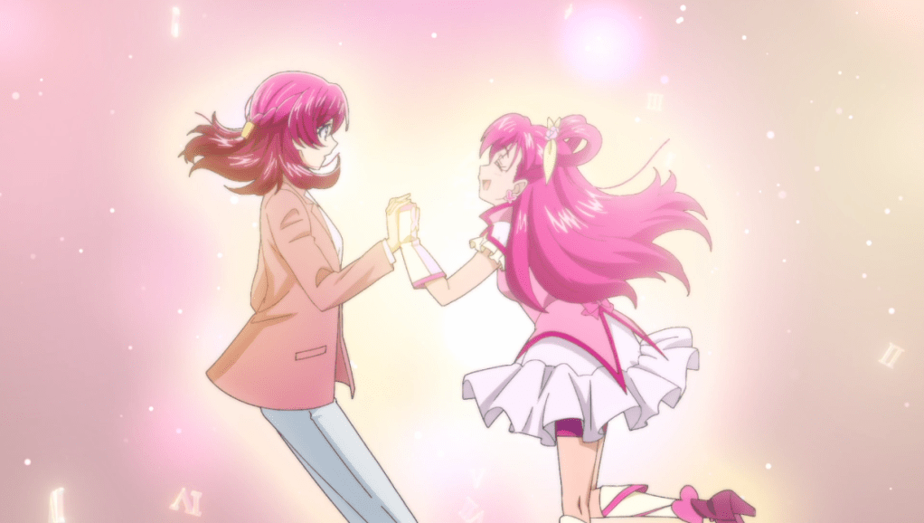 I wasn’t going to do this one, since it is a follow-up to PreCure 5 and its related titles, and I haven’t seen any of those. However, commentary suggesting that you don’t really need to know the predecessor to be able to make sense of this one, coupled with a concept that always intrigues me – i.e., what are the heroes doing 10 years later, after all of the heroics are done? – encouraged me to go back and give this one a chance.
