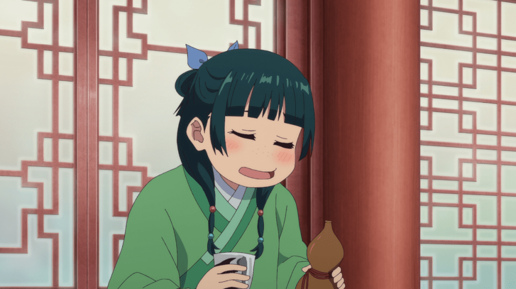 On the humorous side, watching someone as elegant and proper as Gyokuyou continue to bust a gut over Maomao’s highly misleading explanation about how she awarded Lihaku for being her guarantor is entertaining in itself, but so is Maomao’s reaction to getting her hands on some alcohol. (Given her background, it’s really not surprising that she would have had opportunities to develop a taste for it young.) Jinshi is a little too sharp to always be the victim in such situations, though, and so seeing him get back at Maomao a bit with the probably-made-up-on-the-spot proposed law about changing the legal drinking age was quite fitting. The explanation for why Maomao isn’t allowed to touch corpses is also fitting, as is everyone’s reactions to hearing it; Maomao even seems to sheepishly acknowledge that her father wasn’t wrong about her on this point.