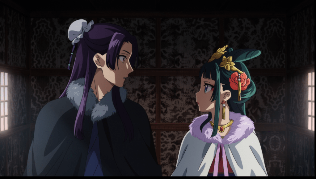 After a week off, the second half of the series begins, shifting the adaptation into the territory of the second light novel and the 5th manga volume. This also marks a significant change in the setting: instead of being in the Rear/Inner Palace, Maomao is now working in the Outer Palace, directly under Jinshi. (Fear not about the Rear Palace being left behind, however; as the Next Episode preview hints, she’ll be back there for a visit shortly.) While that makes this effectively a set-up episode for the second half of the series, there’s still a lot going on here, and especially a lot of little hints about future directions.