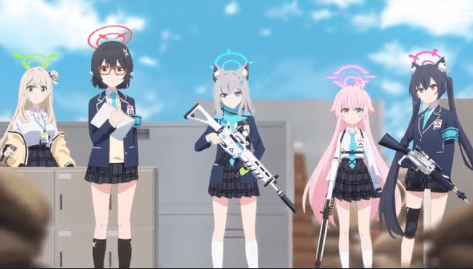 The setting is Kivotos, an academy city somewhat in the spirit of Asterisk from the series The Asterisk War. The city is ruled over by a General Student Council, but with the Council’s President now mysteriously absent (which may have something to do with the bloodied girl on a train at the episode’s beginning), the city is in chaos. The handful of remaining girls at Abydos High School struggle to maintain the school despite a massive debt and attacks from outside gangs. That is, until a male teacher (the player in the game version) is sent to help them.