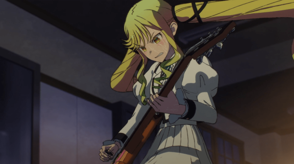 The biggest negative to this manga adaptation debut is that Ririsa may have some of the most ridiculously overblown twin tails ever seen in anime form. (Really, how does she get through most doorways with those?) But against the rock elements of the episode, things like that and the deliberately-generic elite girl’s school design don’t matter. The musical part sizzles, to the point that I’ll forgive it occasionally leaning on some CG in some shots in the animation of the musical duel; this is still one of the most thoroughly-detailed instrumental performances that you’ll see in any anime. But the even bigger treat may be Otoha’s reaction to their jam session. Add in more than a tinge of yuri-baiting, music from the rock band Band-Maid, and some not-so-subtle use of symbolism and you have an episode that may start slow but winds up being a sizzling viewing experience. This was a highly-anticipated series, and it absolutely proves to be a keeper.