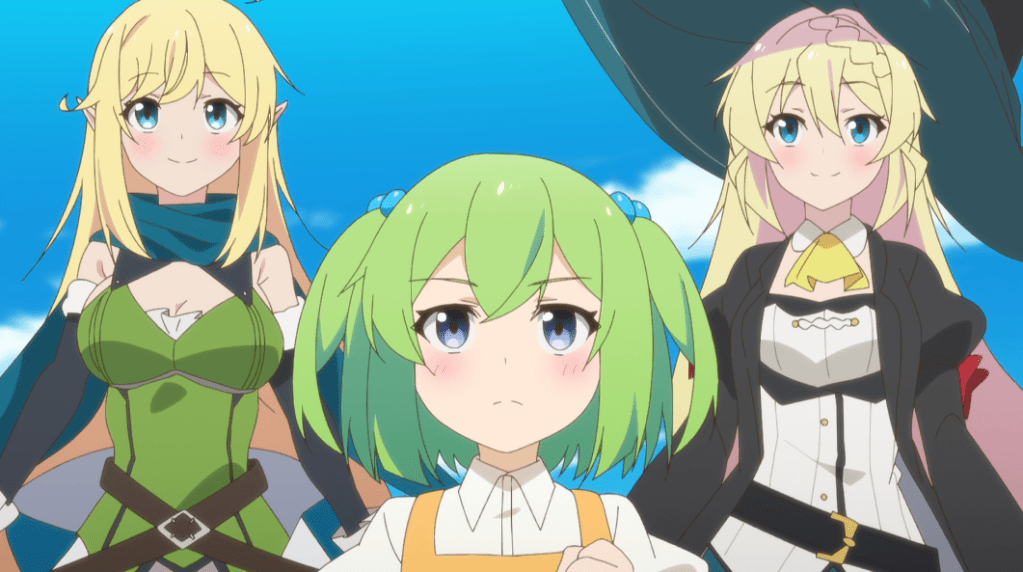 Since it has been four years since the first season, the episode opens with a very brief recap of the premise and major events from the first season before seguing into Azusa discovering rice and an equivalent to azuki beans on an herb-gathering expedition to the south. She decides to use the latter to make manju, and after some experimentation produces a slime-themed version which proves to be a hit product in Flatta. Later, she travels to the capital to meet a goddess who is making personal appearance, and the goddess turns out to be remarkably familiar. . . But that’s really about it. Nothing particularly exciting is going on here, but the charm of this one has always been in Azusa and her makeshift family doing things together, so that’s not necessarily a negative. The ED suggests that a new regular will be joining the crew eventually, so that’s something to look forward to.