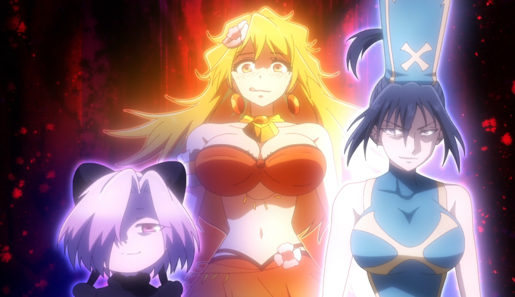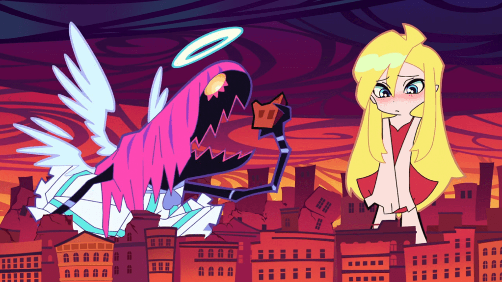The original 2010 series was, essentially, studio GAINAX’s take on crude, adult-oriented American cartoons popular at the time on Cartoon Network, and it was definitely a love-it-or-hate-it animal. It featured spectacularly creative animation to go with all the sexual references, gross-out gags, and parodies in a story about fallen angels Panty and Stocking, who live in Daten City with the priest Garterbelt and exterminate ghosts, an endeavor which only occasionally interrupted all manner of indecent behavior. Now GAINAX’s descendant, studio Trigger, has resurrected the series under original director Hiroyuki Imaishi for another eye-popping round of insanity.