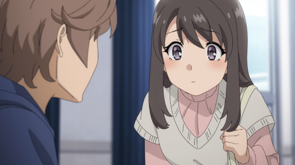 This series is a sequel to the movies Dreaming Girl, Sister Venturing Out, and Knapsack Kid, rather than directly to the first TV season, so watching those first is essential for making full sense of what’s going on here. Essentially, the first episode serves as a transition point between earlier stories and the next one as the setting shifts to Sakuta at university. Sakuta’s romance with Mai continues apace, Kaede is now well-adjusted and even working (apparently at the same restaurant Sakuta works at), and Shoko, who seems to remember everything, has moved to Okinawa. But among all the mundanity, there are naturally hints that something is amiss. A mysterious singer who wasn’t on anyone’s radar before has become a hit in the wake of the timeline changes Shoko’s situation brought about, and Nodoka’s fellow Sweet Bullet member Uzuki, who is causing some stress in the band because of solo projects, seems to be acting oddly. And there is a girl popping up in a sexy Santa Claus outfit who may be Uzuki. . .