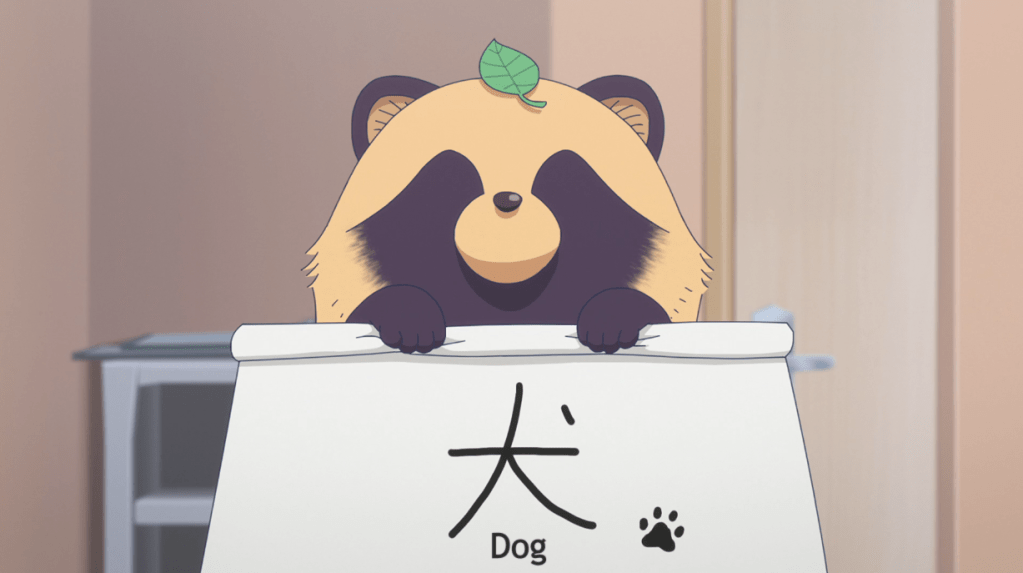 A young novelist (her name is never given) living on her own comes across an abandoned animal in a box one rainy night and decides to take it home. It’s clearly a tanuki but tries to convince her, a vet, and later a cat-loving man in a park that it’s actually a dog, and she, at least, buys it even though no dog would be able to write on cue cards.