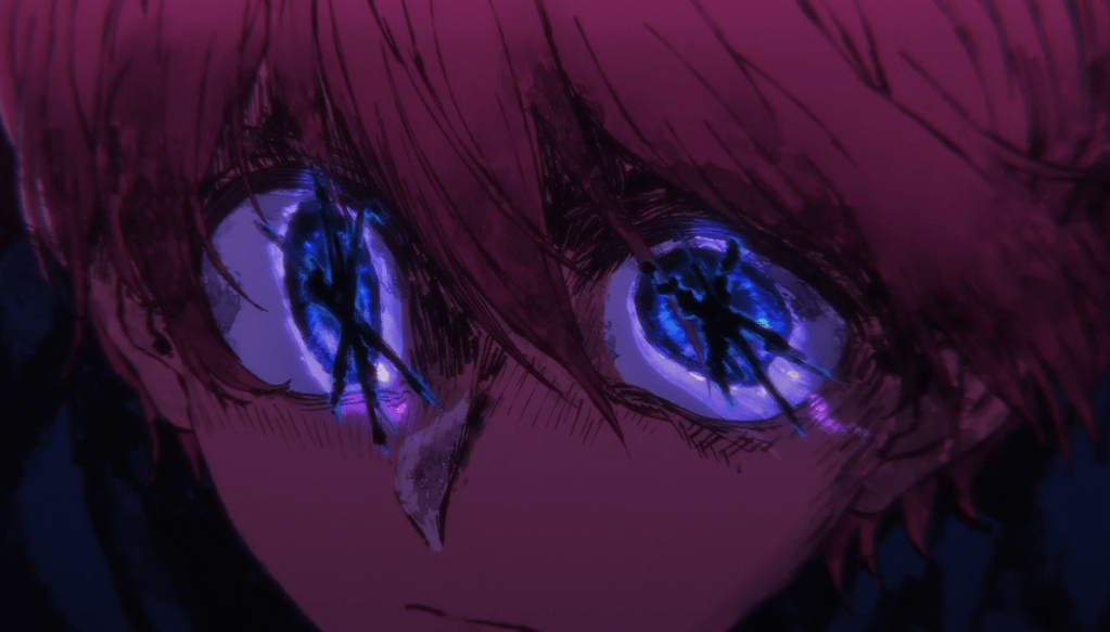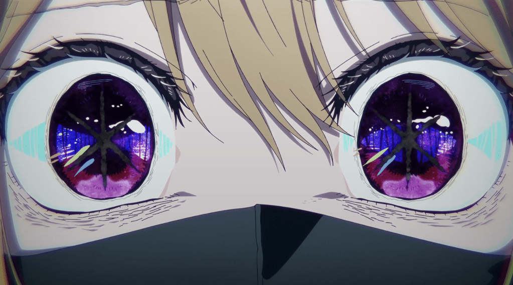 Frankly, I love how this adaptation handles this part. The directorial and musical choices lend real weight to the impact of this revelation, and by jumping around we get to see an all-too-realistic array of reactions. Some are stunned, others respond with disappointment about how it tarnishes their memory of a beloved idol, and still others suspect that Aqua might have spilled the beans as part of a strategy to get ahead or just use this as an opportunity to bad-mouth both idols and their agencies in general. (And you know this would happen IRL). But there are also fans touched by the emotional resonance of the story – that Ruby is literally following in her mother’s footsteps, and what better way to honor her mother’s memory? And while there are some reactions we don’t see that I wish we would (Kana’s in particular, as once she gets over the shock, she’ll have to realize that the timing here isn’t coincidence), the most impactful one is Ruby’s. She’s on record as having intended to take the secret that Ai was her mother to the grave, and that Aqua would pull this stunt without consulting her in more than a vague way has undoubtedly left her furious, to the point that we get another striking, never-before-seen eye pattern, with those dark stars now glimmering: