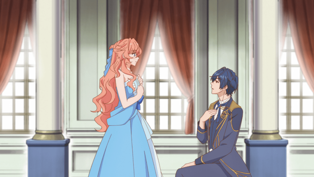 Tiararose (yes, really her name) is a noblewoman of high standing who’s engaged to her kingdom’s prince. She’s worked to prepare to be a proper queen, but is so thrown for a loop which she sees the prince, her fiancé, with a commoner girl he clearly is into that she recalls that she’s actually been reincarnated into the world of an otome game she played many times in her previous life and realizes she’s in the role of the villainess. She sees signs that she’s being railroaded into Tiararose’s condemnation scene, so she braces herself for it, only to find herself saved from banishment by a proposal from Aquasteed Marineforest (yes, really his name), the prince of a neighboring kingdom, who has long been interested in Tiararose. But since Tiararose died in her previous life before getting to play the sequel game featuring Aquasteed, she now has no idea what will happen next.