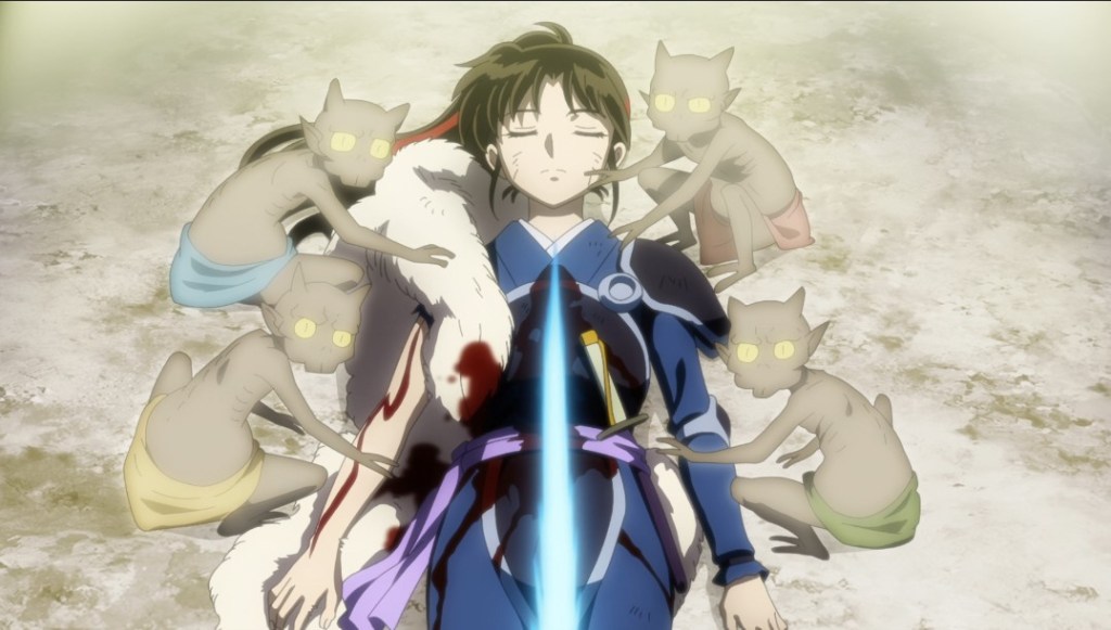 The Inuyasha sequel is back, beginning with a short recap of events from the first half. Then it’s on to Towa trying to use the broken Tenseiga to bring Setsuna back to life, all under the impassive, watchful eye of her father, Sesshomaru. Meanwhile, Totosai arrives on the scene and constructs a new naginata – one that can “cut that which cannot be cut” – for Setsuna while Moroha and Kirara fend off a horde of demons attracted by what Totosai is doing.